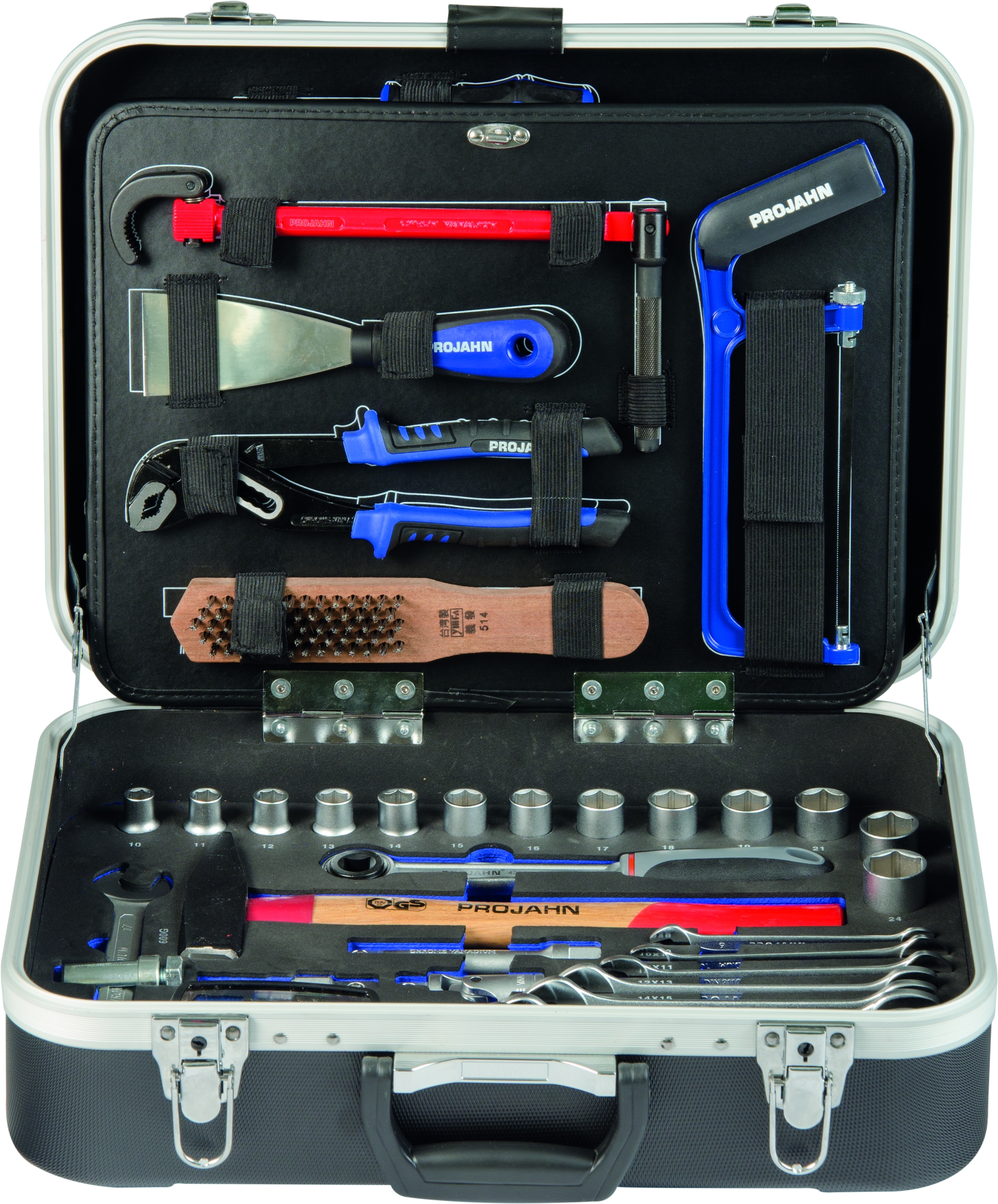 Der 95-teilige Werkzeugkoffer aus ABS von Projahn ist sehr robust, das Werkzeug ist auf Tafeln übersichtlich angeordnet und gegen Herausfallen gesichert.