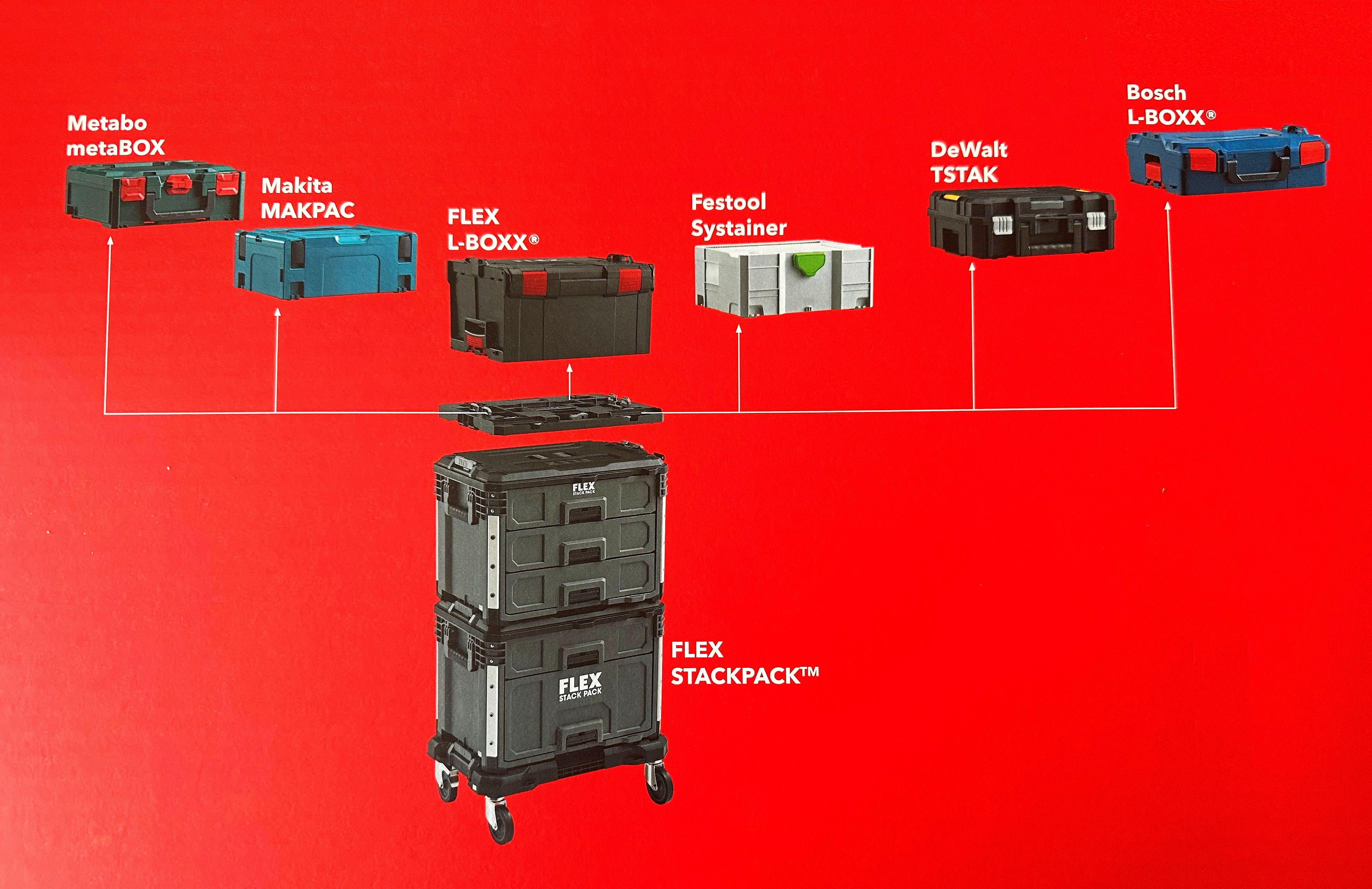 Metabo/metaBOX, Makita/MakPac, FLEX/L-Boxx, Festool/Systainer, DeWalt/Tstak, Bosch/L-Boxx.