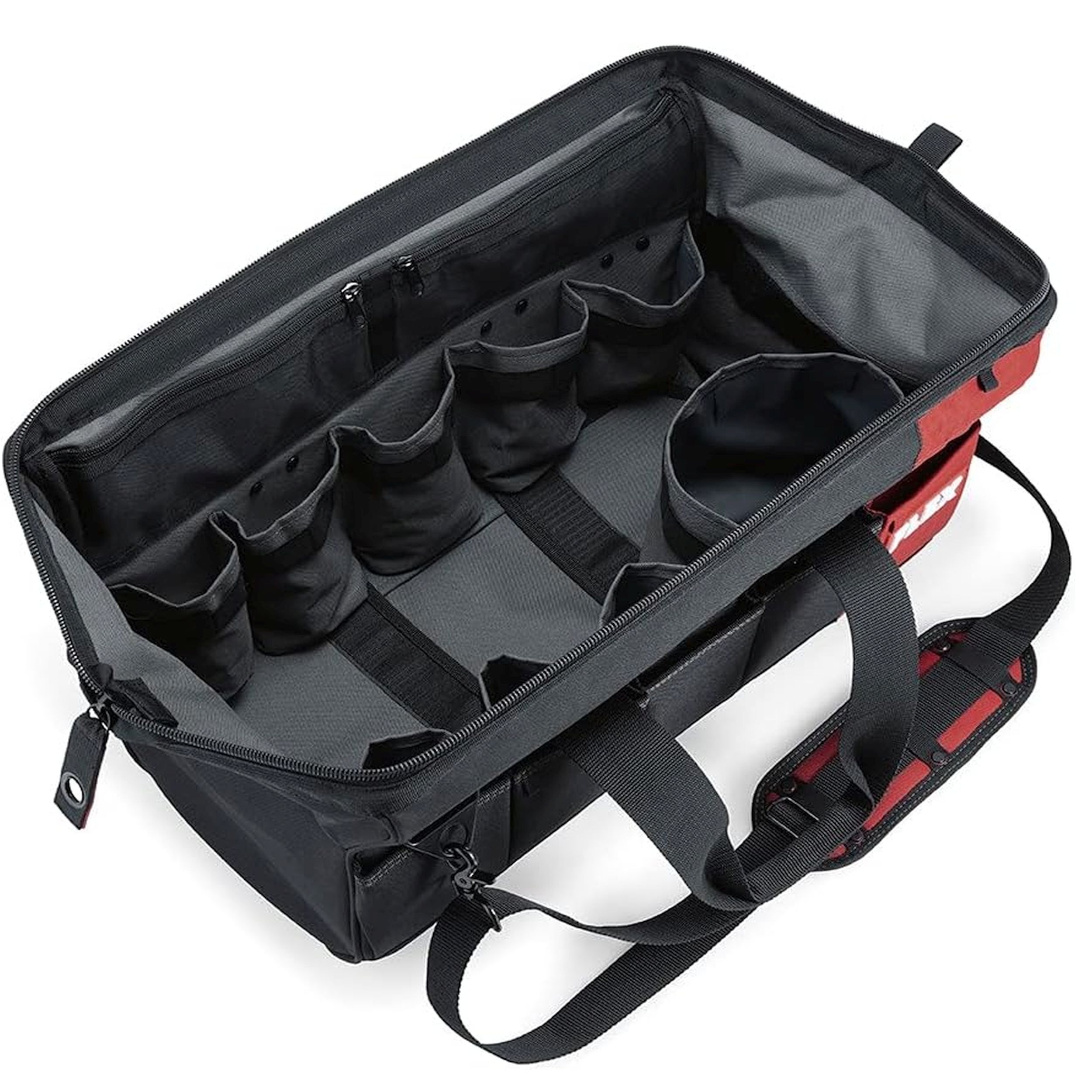 • Mit großem Stauraum im Innenteil für bis zu drei Maschinen sowie Fächern für Zubehöre wie Akkus, Ladegerät etc. und fünf Außentaschen an der Vorderseite
