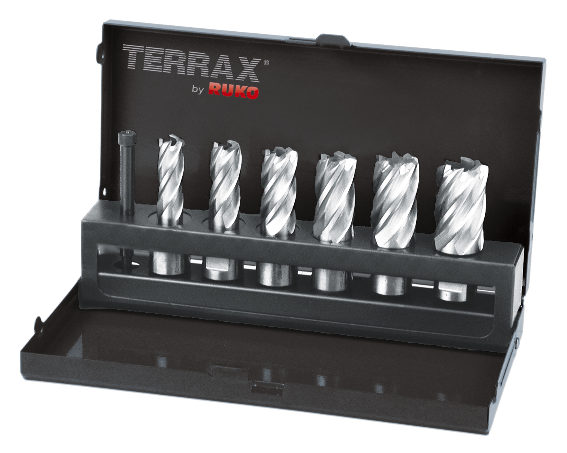 Der 7-teilige HSS Kernbohrer-Satz von RUKO-TerraX ist mit Weldonschaft (3/4") und wird in einer praktischen Industriekassette geliefert.